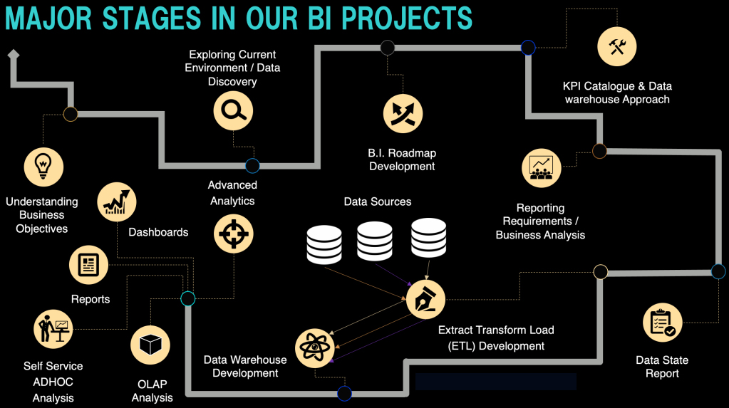 At DM, we use our tried and tested approach of first understanding business goals and objectives for a BI implementation. Followed by deliberating on existing data sources and prevailing IT environment. Finally, the nature and variety of applications running in the organisation. Taking in to consideration the gathered information, we devise a BI implementation roadmap that highlights the best technology stack / BI platform for business. This leads to interaction with business units and KPI cataloging and selecting the best approach for designing DW. Consequently, business and reporting requirements are gathered and pseudo dashboards are developed and approved. A report on data state is developed that helps the data engineers in cleansing the data. Keeping in to consideration the requirements and observations in data state report ETL is developed. Selected data tables or variables within them are extracted, transformed and loaded in to the DW.